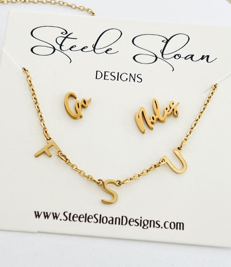 Adorable Game Day earrings to support FSU Fans!  These gold stud earrings are made of hypoallergenic surgical grade stainless steel – great for sensitive ears and non-tarnish – THE Perfect gift for Florida State Seminole Fans! These are smaller earrings and great to wear on one ear as shown as a double piercing – can also wear Go on one ear and Noles on the other – Go measures approximately 1/4 inch and Noles 1/2 inch – all FSU Seminole Fans will love!  (more pictures soon!). This listing is for One Pair of Go Noles earrings only****Also shown with our new FSU Charm necklace available here: FSU Charm Necklace
