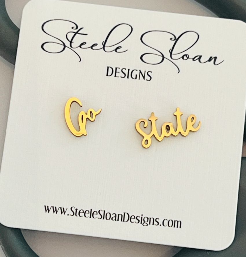 Go State Gold Stud Earrings – Hypoallergenic Stainless Steel – Go measures approximately 1/4 inch and State measures just at 1/2 inch