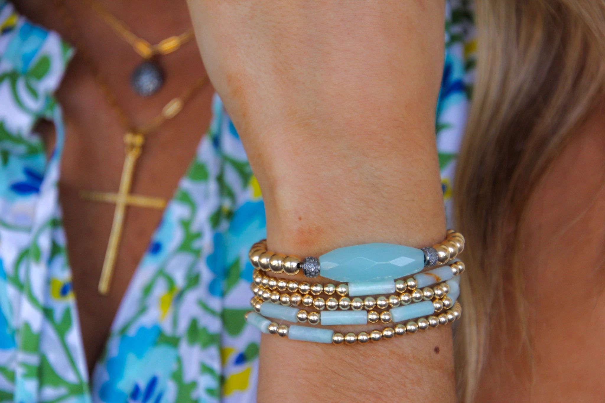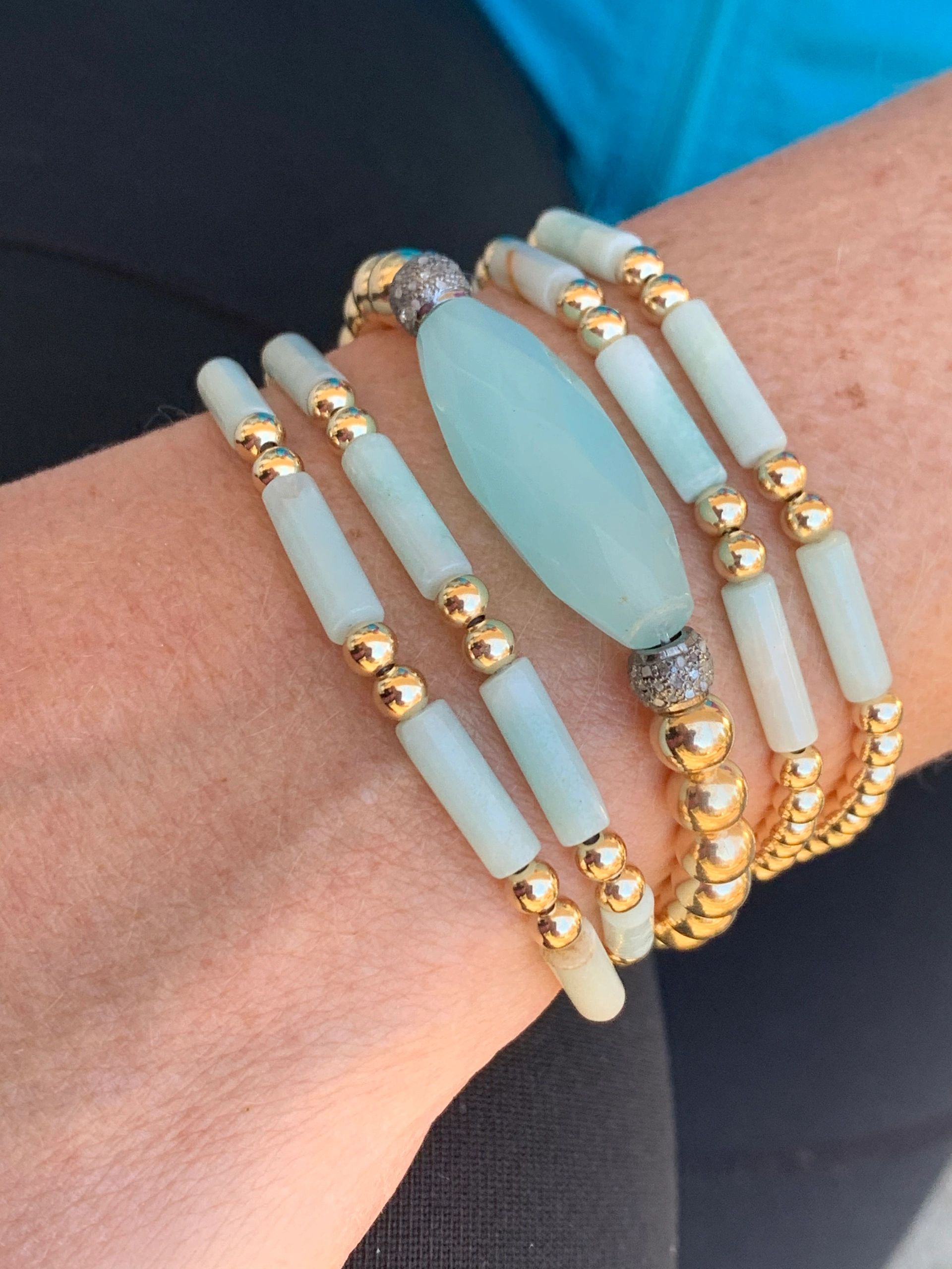 As shown with our Amazonite and Gold Bead Bracelet Set:Â https://www.etsy.com/listing/953551250/gold-bead-and-amazonite-4-bracelet-stack