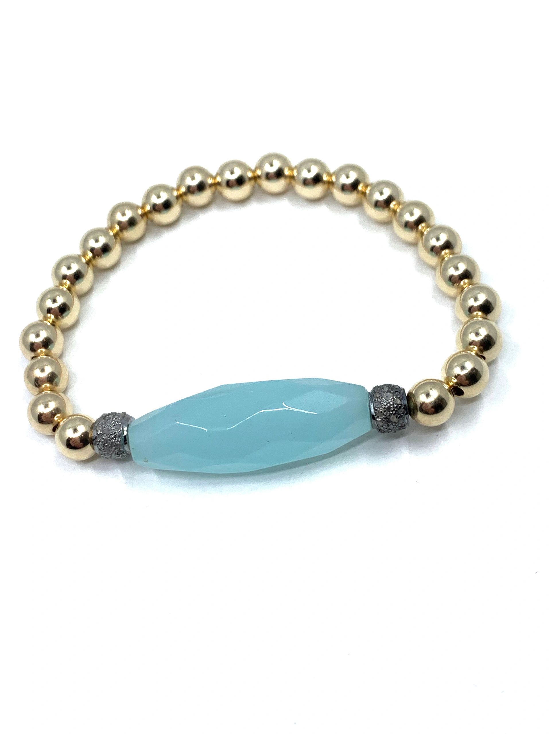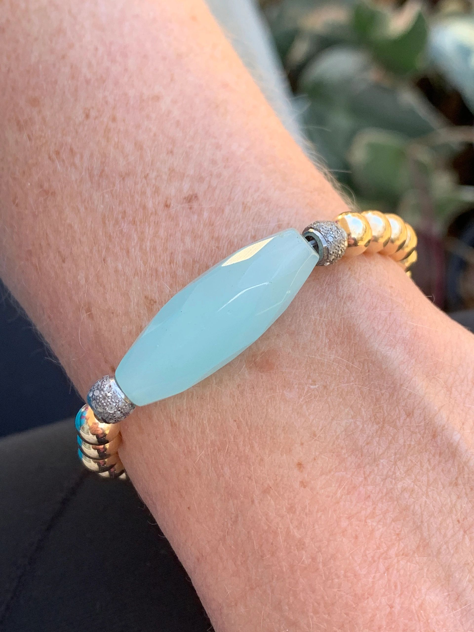 Gold Bead Bracelet in 6mm (14K gold filled) Accented with Faceted Aquamarine and Pave Diamonds – Faceted Aquamarine Stone measures just at 1 1/4 inch