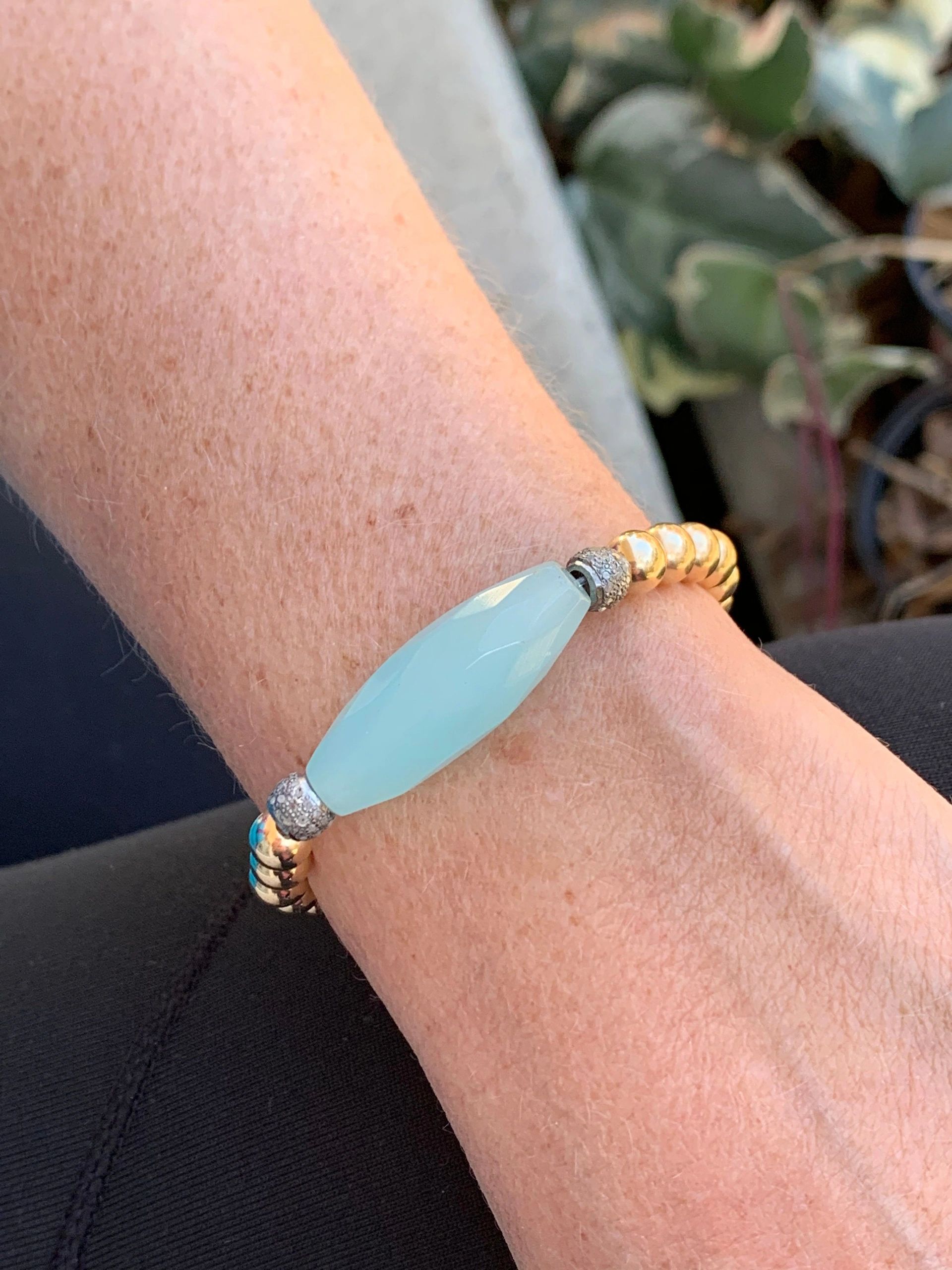 Gold Bead Bracelet with Pave Diamond and Aquamarine Stack Bracelet