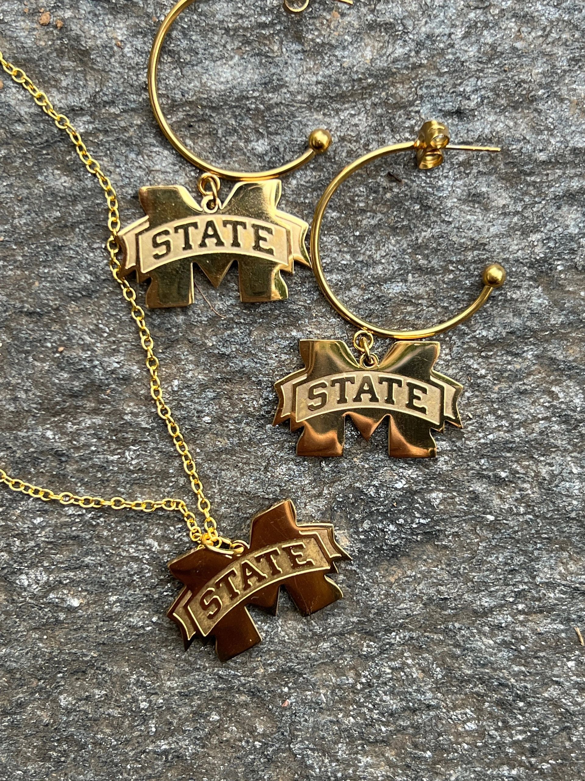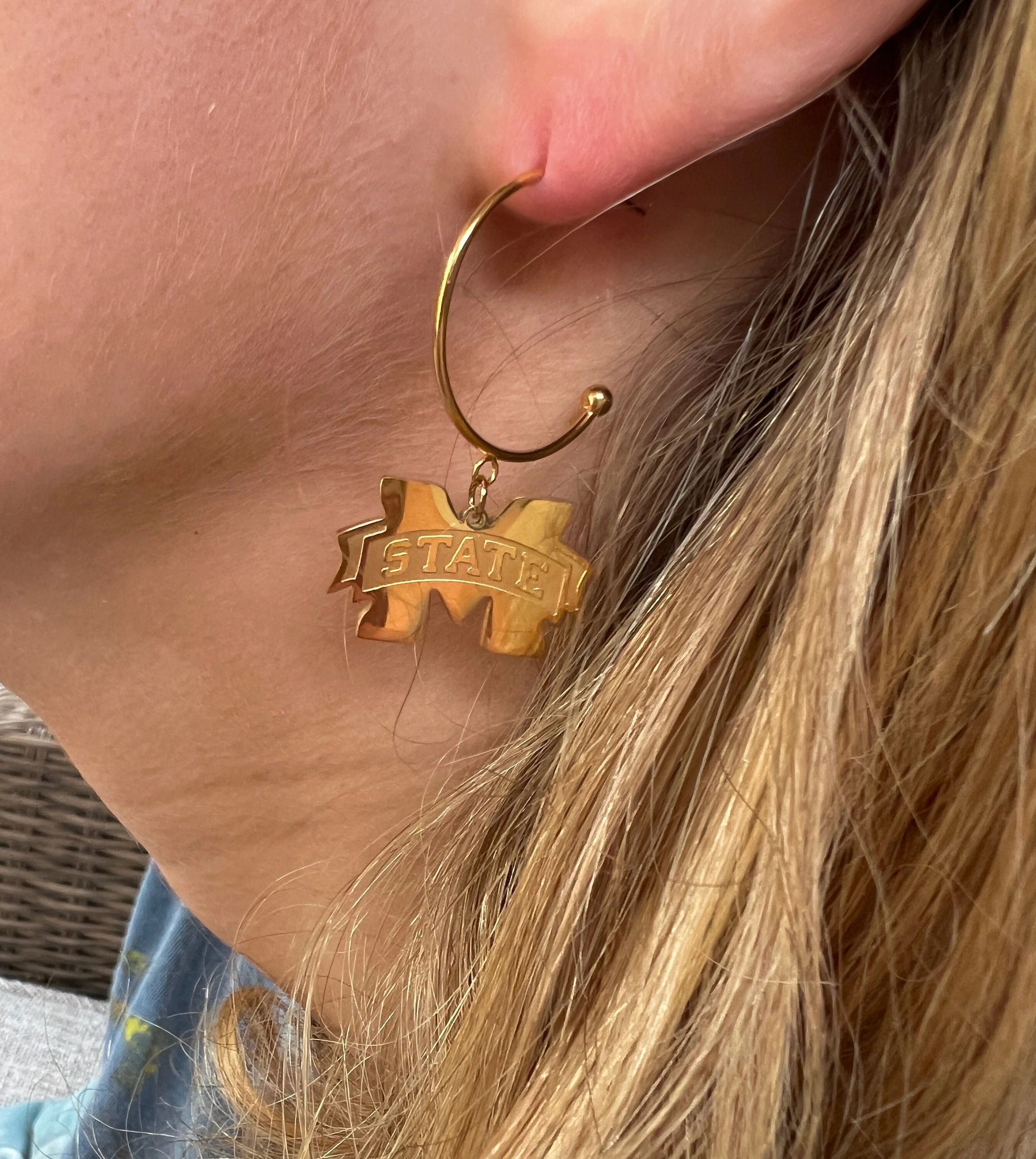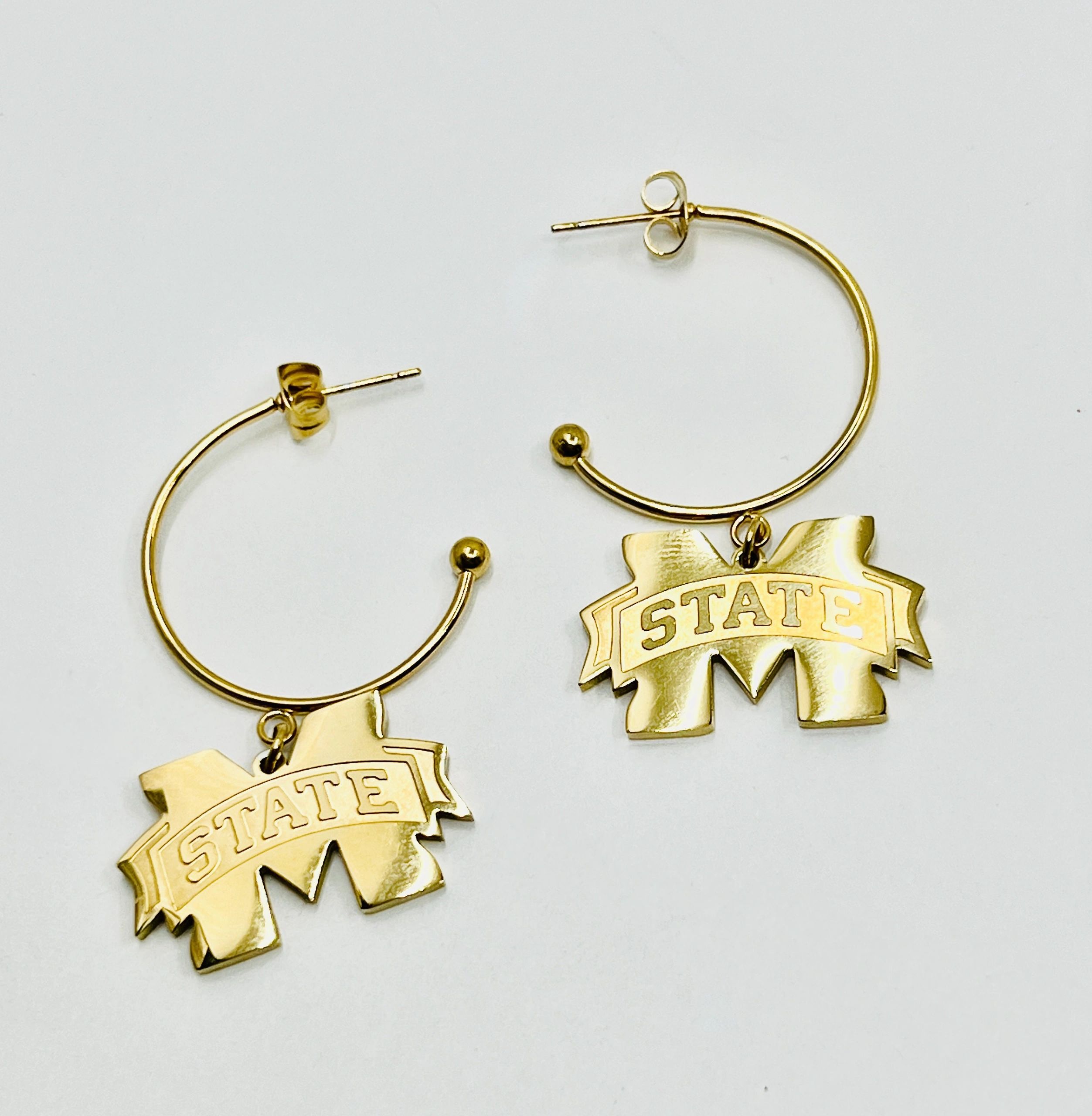 Mississippi State Gold Hoop Earrings- Perfect Mississippi State Bulldog Gift – Perfect for GameDay Miss State Hypoallergenic Stainless SteelMississippi State Gold Hoop Earrings in hypoallergenic stainless steel great for sensitive ears- These will be perfect Mississippi State Bulldog gifts and Perfect for Game Day! Approx 1 inch hoop earring and Mississippi State pendant measures 1 inch width by 3/4 inch height. Officially licensed. #mississippistate #HailState #mississippistategift #graduationgift #bulldogs #cowbell #gamedayearringsYou may also like:Hail State Stud Earrings: https://www.etsy.com/listing/1463768273/mississippi-state-hail-state-gold-studSilver Miss State Stud Earrings: https://www.etsy.com/listing/1484876665/mississippi-state-silver-stud-earringsGold Miss State Stud Earrings: https://www.etsy.com/listing/1462478912/mississippi-state-perfect-gift-logoBulldog Earrings: https://www.etsy.com/listing/926997911/adorable-bulldog-earringscondition: newmsrp: 0.0category: Jewelry > Earrings > Hoop Earrings