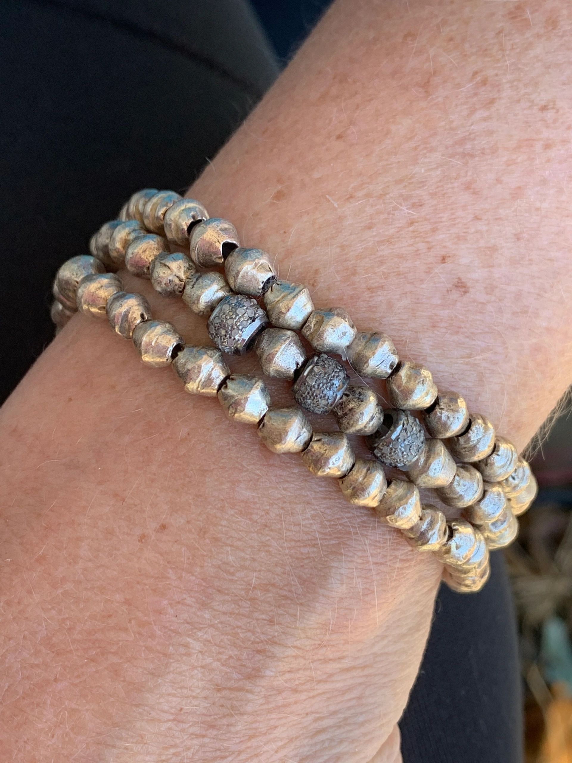 These stack bracelets  standard measurement is 6 1/2 inch with slight stretch – (can be customized if you need a different size – just ask)  Two plain pewter bracelets and one pewter bead bracelet with 3 pave diamond accent beads –